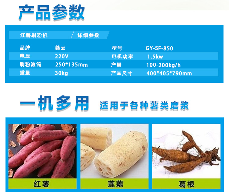紅薯刷粉機(jī)適用于加工番薯/紅薯、木薯、馬鈴薯、蕉藕、芋頭及其它塊根作物的磨碎作業(yè),加工成粉。適用于山區(qū)、半山區(qū)的糧食加工廠及普通用戶?膳溆220V的1.5KW電機(jī)使用,也可配用柴油機(jī),目前價(jià)格配的是國(guó)標(biāo)銅線電機(jī)!