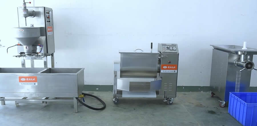 這一整套設(shè)備包含有:絞肉機、拌餡機、獅子頭肉丸成型機、智能溫控雙加熱水槽,這4臺設(shè)備組合可達(dá)到日產(chǎn)1噸肉丸,接下看看由贛云機械操作的機器全過程。