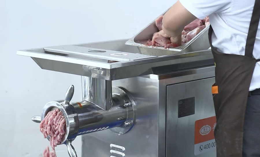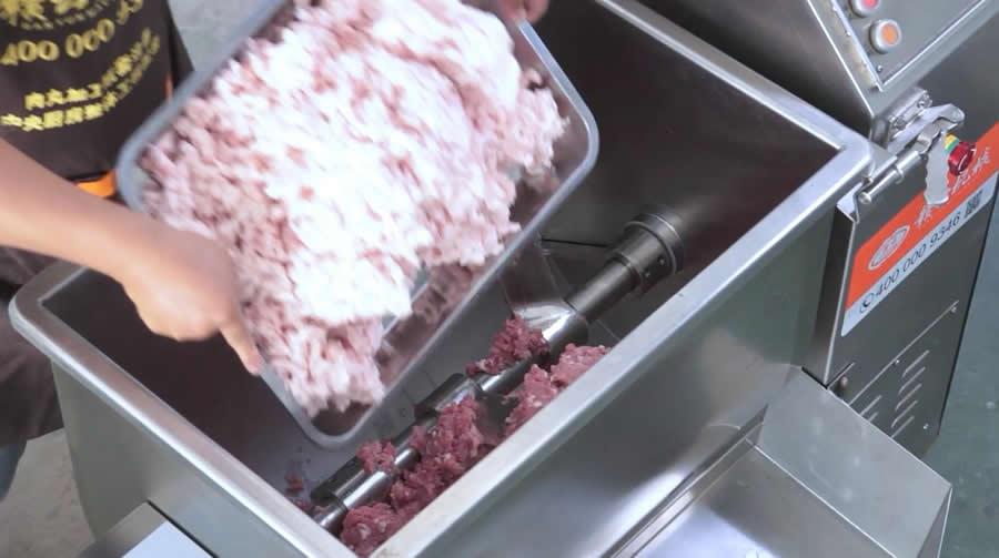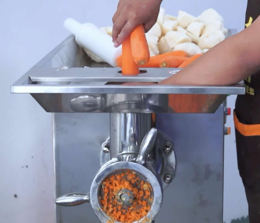 首先將所有原料準(zhǔn)備好,原料有:鮮豬肉(比例為:瘦6肥4)、胡蘿卜、生姜、小蒜、馬蹄、淀粉、冰水等。第一步是需要將原料通過絞肉機絞碎,這一步是使用贛云42型不銹鋼絞肉機,這臺機器可以用于鮮肉、微凍肉類、蔬菜等絞碎,機器動力強勁,絞肉速度快,每小時可達(dá)600公斤。