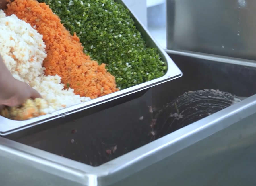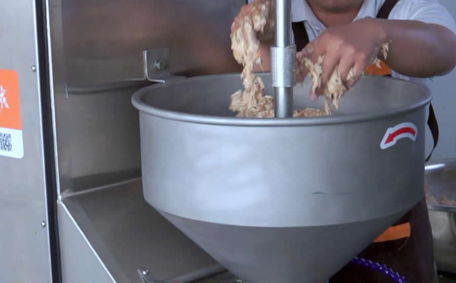 將通過絞切處理后的食材根據(jù)工藝比例倒入這臺自動化不銹鋼拌餡機。拌餡機可對粒狀、粉狀、泥狀物料根據(jù)需求設(shè)定攪拌時間,機器擁有5槳交錯攪拌,操作過程中可自動切換正反轉(zhuǎn),這臺機器單次一桶可加工100L物料。