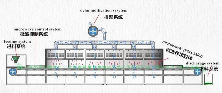 2.微波烘干區(qū)域:烘干區(qū)域是一個(gè)位于隧道中間區(qū)域,待烘干的物體通過(guò)輸送帶進(jìn)烘干室內(nèi)進(jìn)行快速烘干。烘干室通常排濕系統(tǒng)和輸送系統(tǒng),周邊由金屬材料構(gòu)成,以防止微波輻射泄露出去。