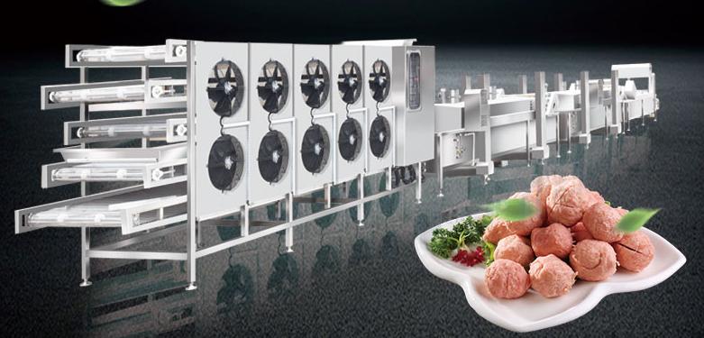 設(shè)備流程展示:凍肉切塊機(jī)―輸送提升機(jī)―絞肉機(jī)―智能液壓升降打漿機(jī)―變頻雙調(diào)速肉丸成型機(jī)―肉丸緩沖區(qū)―低溫定型流水線―高溫熟化流水線―水冷槽―提升機(jī)―多層風(fēng)冷線